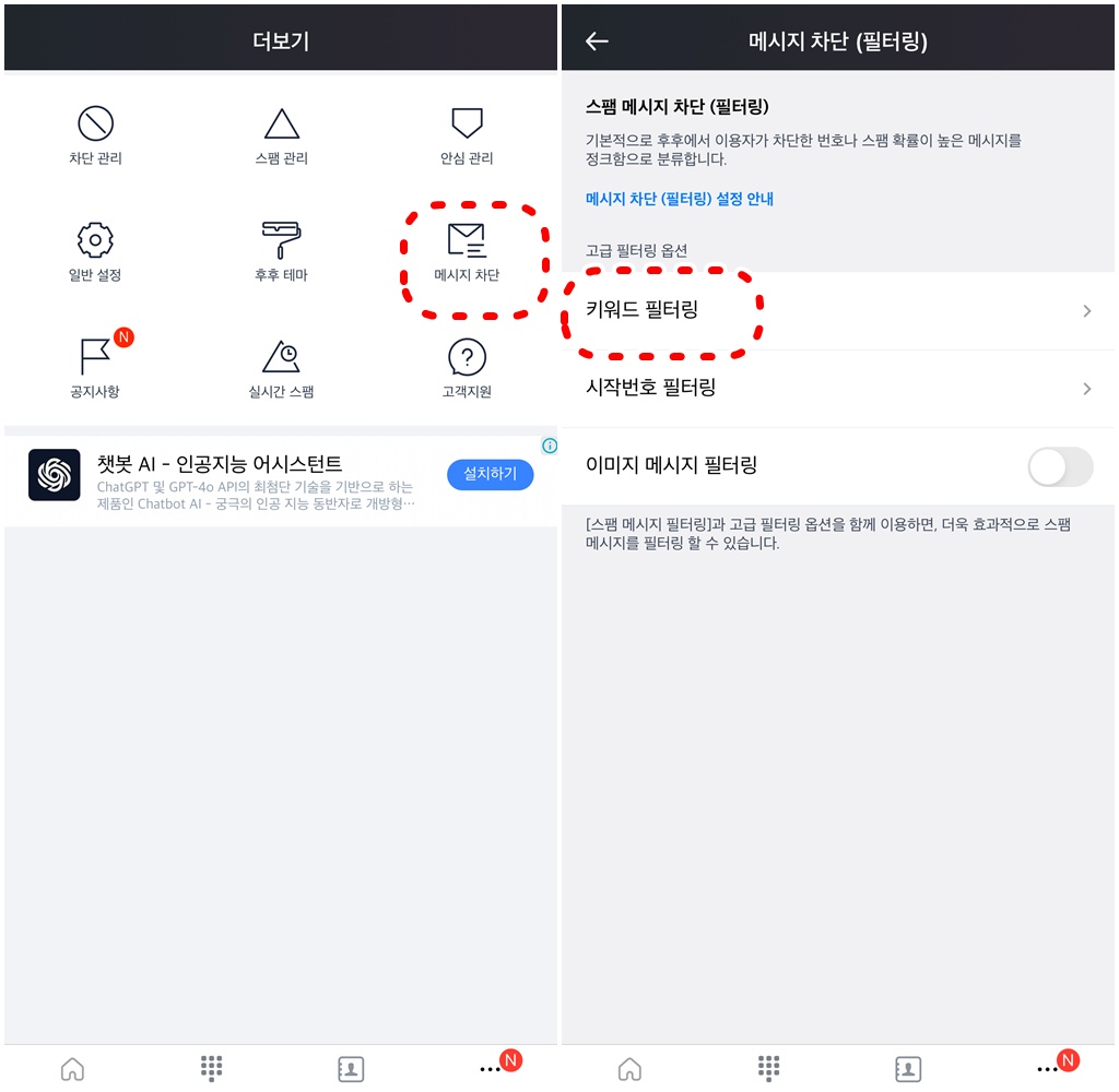 - 국제문자, me2.kr 같은 스팸 도메인을 추가해 차단 키워드를 설정하세요.