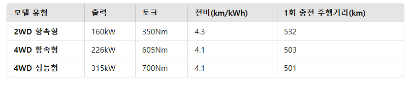 또한, 400·800V 멀티 초고속 충전 시스템을 통해 350kW급 충전기로 24분 만에 배터리 용량을 10%에서 80%까지 충전할 수 있어 충전 시간의 혁신을 이뤘습니다. 다음은 각 모델별 성능 사양입니다