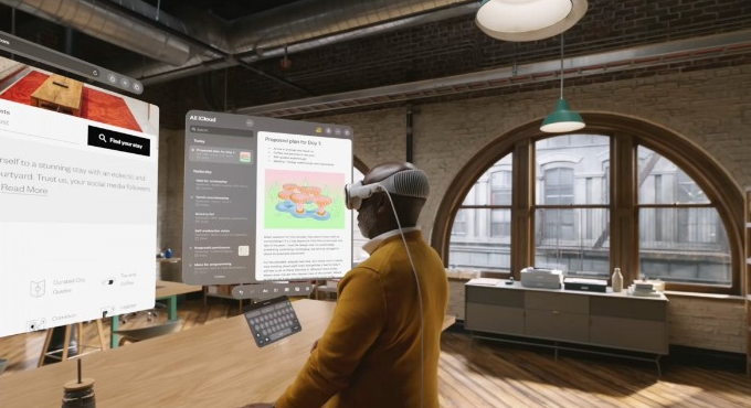 애플비전 기기를 착용한 후, 직원이 기본적인 사용법을 알려주었습니다. 비전 프로의 인터페이스는 손 제스처, 음성 명령, 시선 추적을 통해 조작할 수 있습니다.
