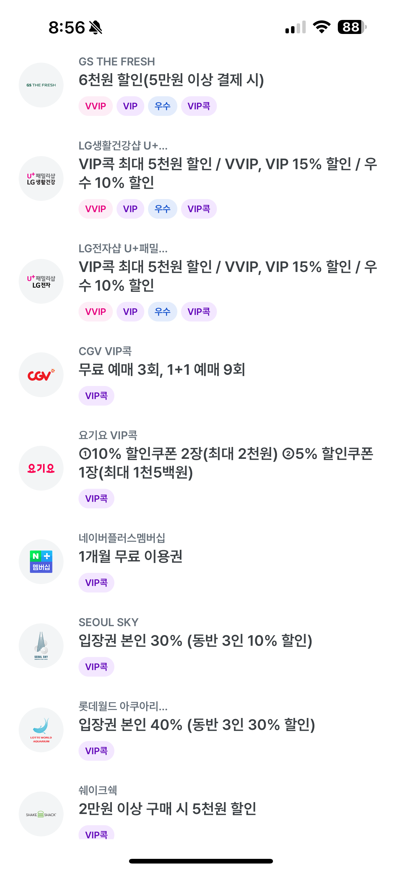 - VVIP 등급: 월정액 95,000원 이상의 요금제를 사용하거나, 연간 통신요금이 200만 원 이상인 고객