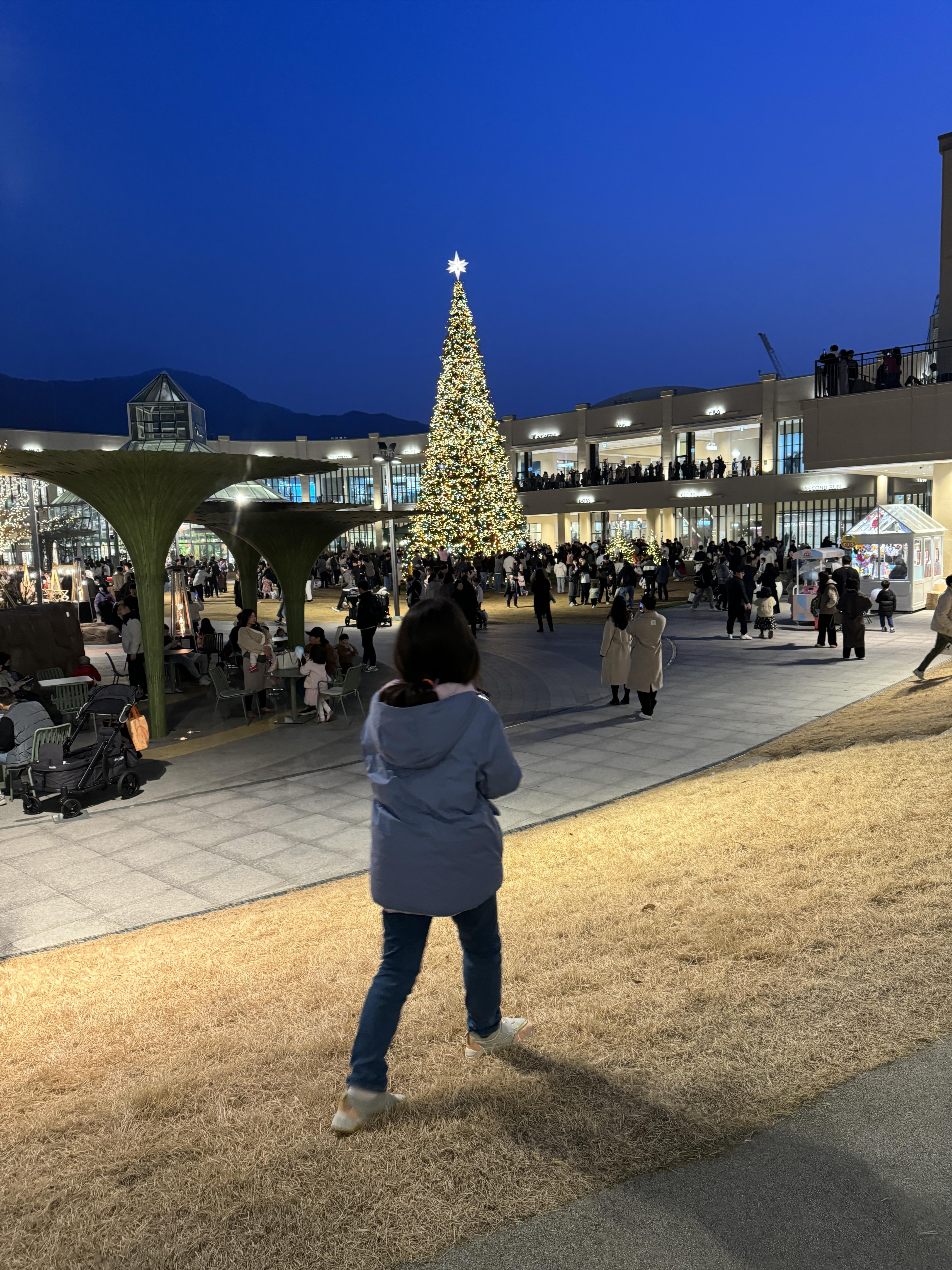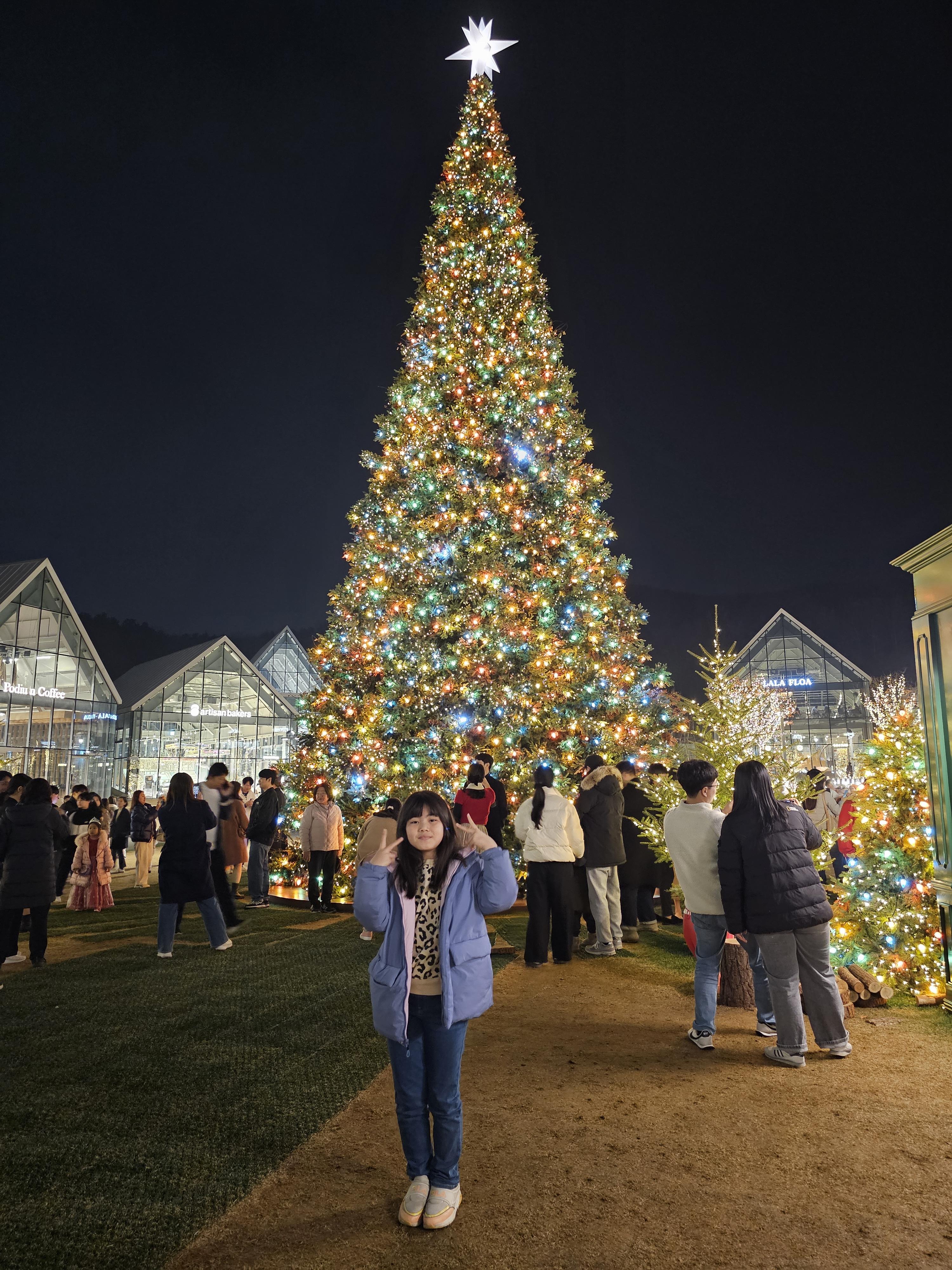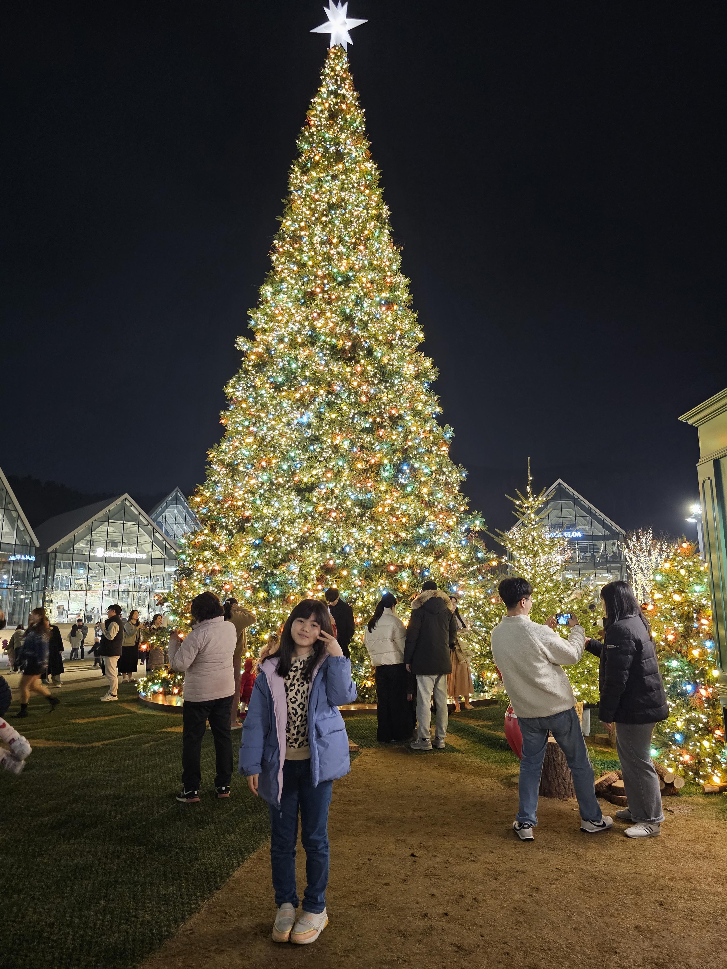 아울렛에 도착하자마자 눈에 들어온 건 중앙 광장에 세워진 거대한 크리스마스 트리였습니다. 다양한 컬러의 조명과 반짝이는 장식들이 트리를 꾸미고 있었는데, 낮에도 충분히 아름다웠지만 밤이 되자 조명이 더 빛나면서 정말 환상적인 분위기를 연출하더군요. 아내와 딸아이도 연신 감탄하며 사진을 찍었는데, 특히 트리 아래에서 찍은 사진은 정말 인생샷이 나왔습니다.