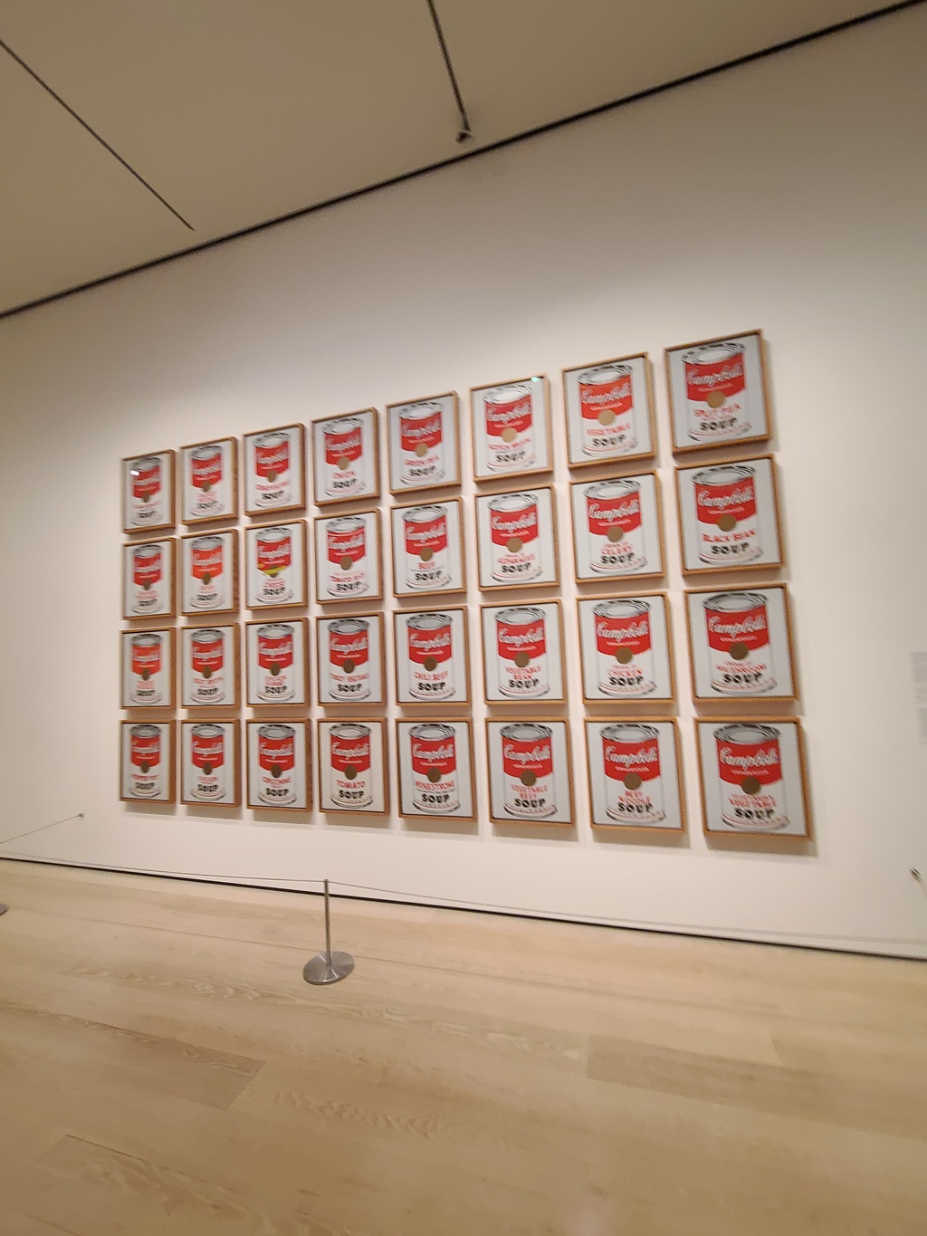 이 작품은 팝아트의 거장 앤디 워홀 (Andy Warhol)의 유명한 작품 캠벨 수프 캔 (Campbell's Soup Cans) 입니다. 앤디 워홀은 대량 생산된 소비재를 예술 작품으로 승화시키며 대중문화와 상업성을 예술의 중심 주제로 다뤘습니다. 이 작품은 32개의 다른 수프 캔을 동일한 형식으로 배열해 팝아트의 대표적인 상징으로 자리 잡았습니다.