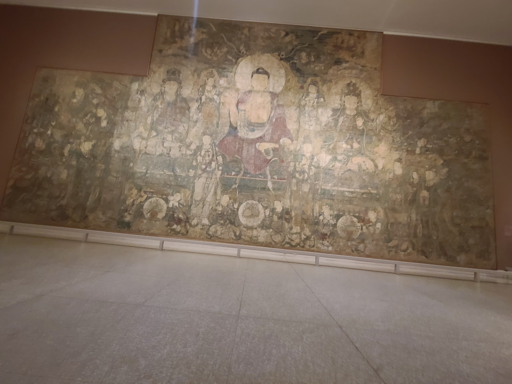 이 작품은 동아시아 불교 미술에서 흔히 볼 수 있는 불화(佛畵)로 보입니다. 중앙에 앉아 있는 부처님과 주변의 보살, 제자들, 신장들이 그려져 있습니다. 도슨 투어 할때 설명을 들었습니다.