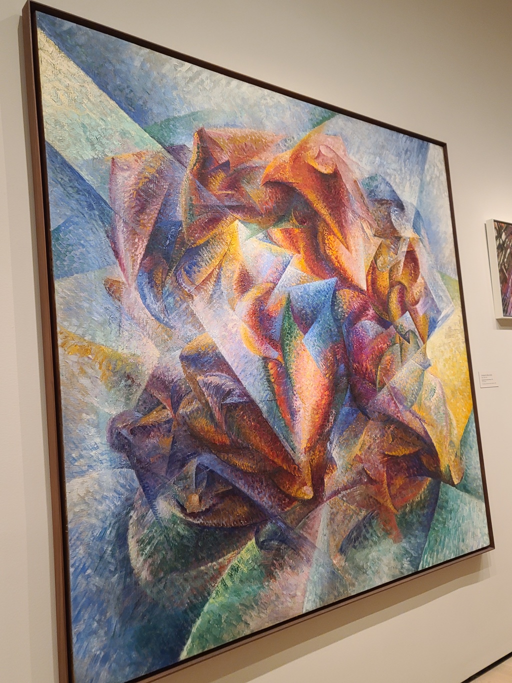 미래주의는 움직임, 에너지, 역동성을 강조하며 기계 시대와 현대성을 찬양한 예술 운동입니다. 이 그림은 보초니의 대표적인 특징인 강렬한 색채와 형태의 분할을 통해 역동적인 움직임과 속도를 표현하고 있습니다. 정확한 제목은 "공간에서의 연속성의 형태 (Unique Forms of Continuity in Space)"이라고 합니다.