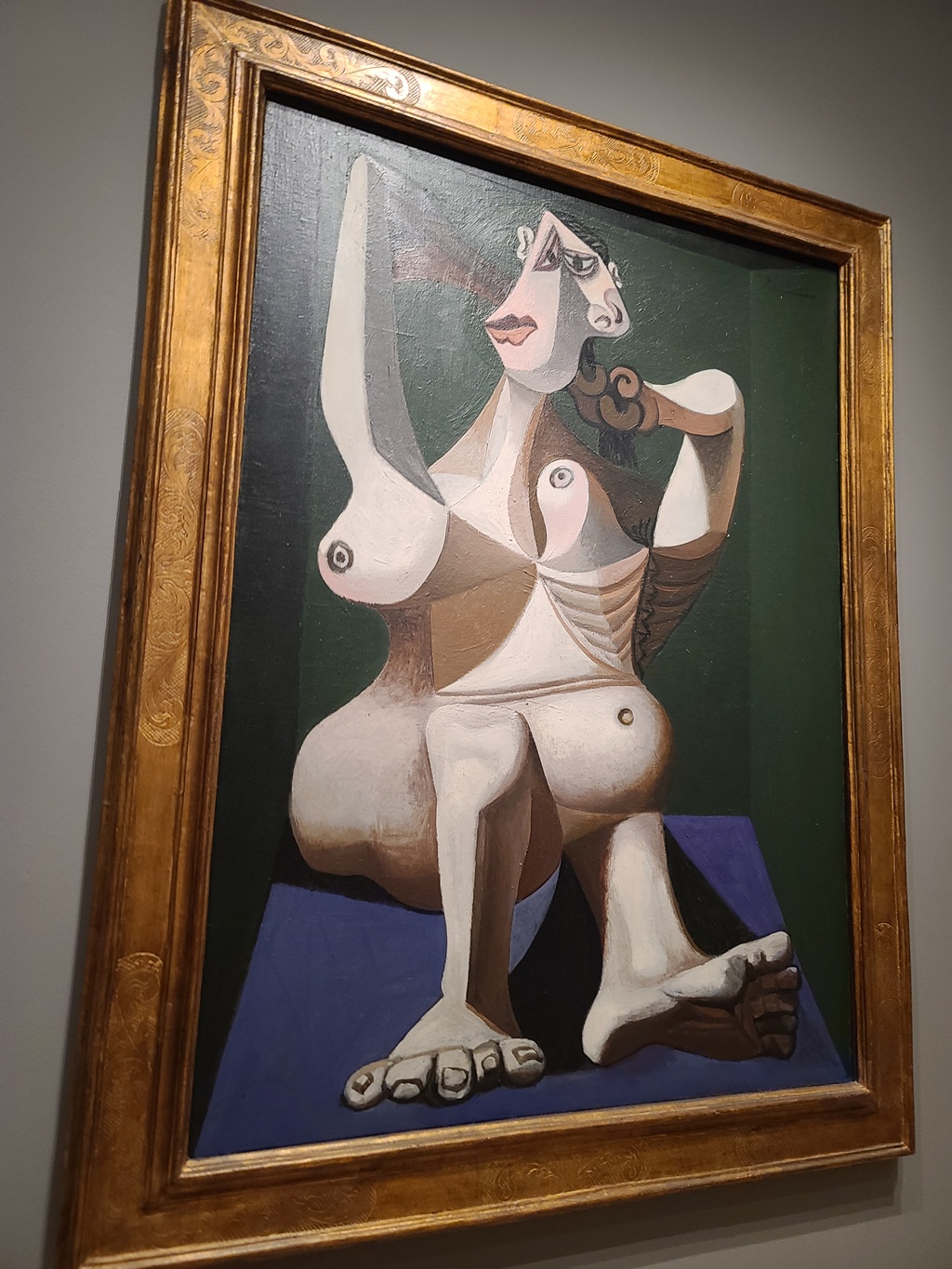 이 작품은 스페인 화가 파블로 피카소 (Pablo Picasso)의 작품 입니다. 그의 후기 큐비즘(Cubism) 스타일을 잘 보여주는 그림으로, 왜곡된 인체와 강렬한 형태, 과장된 표현을 통해 감정과 에너지를 전달하려는 시도가 돋보입니다. 피카소의 큐비즘 시기의 대표작 중 하나죠. 그의 독특한 예술적 시각을 보여주는 걸작입니다.