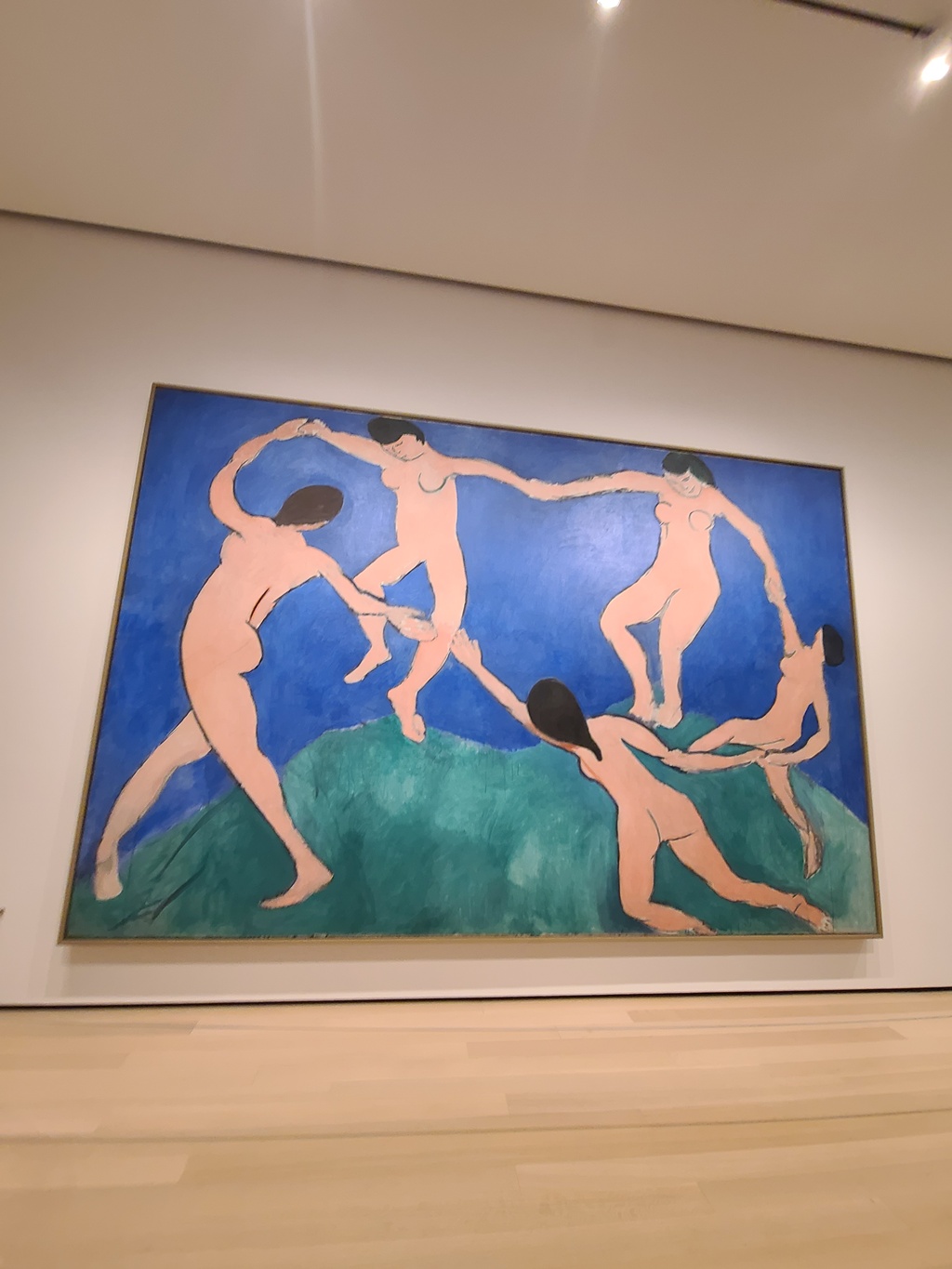 이 작품은 프랑스 화가 앙리 마티스 (Henri Matisse)의 유명한 작품 "춤 (La Danse)"입니다. 1909년에 제작된 이 그림은 마티스의 대표작 중 하나로, 원색적인 색채와 단순화된 형태로 생동감과 자유로움을 표현하고 있습니다. 이 작품은 현대미술에서 중요한 위치를 차지하고 있으며, 마티스의 독창적인 스타일과 에너지를 보여준다고 합니다.