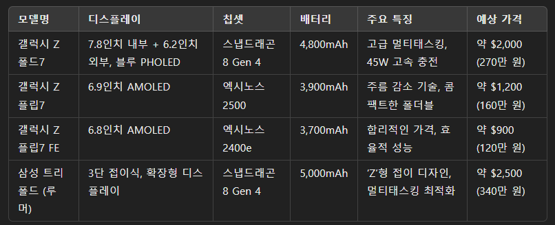 삼성 플래그십 스마트폰 갤럭시 Z 폴드7, 삼성 트리폴드 출시 루머 스펙 가격대
