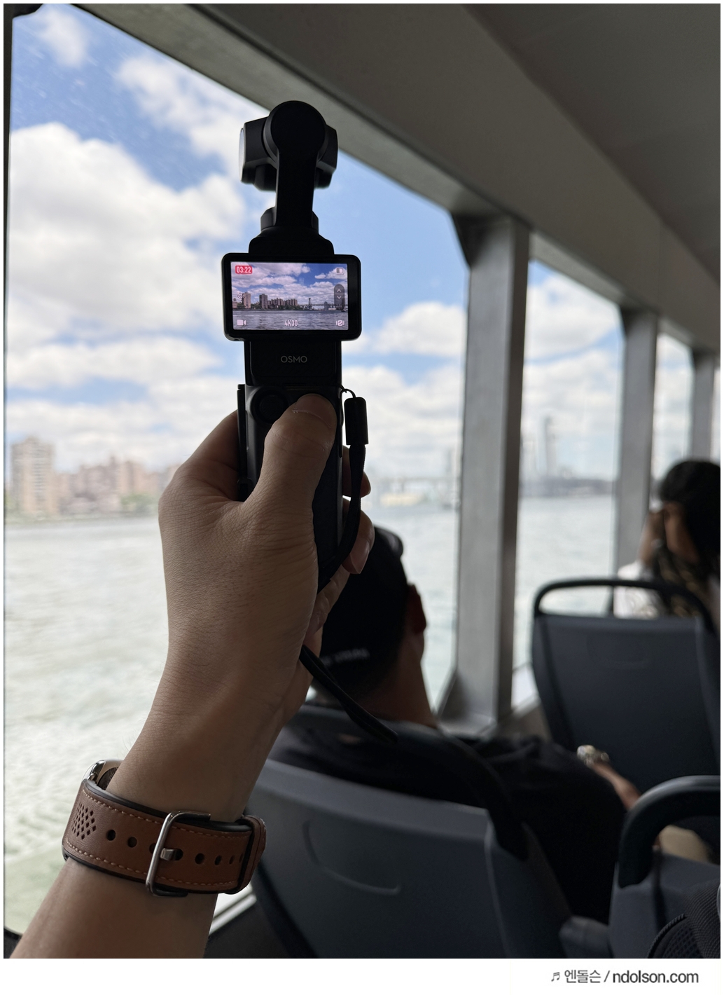 자유의 여신상을 보러 선박을 타고 가는 길, 손에는 오즈모 포켓 3가 들려 있었습니다. 흔들리는 배 위에서도 짐벌이 있어카메라는 전혀 흔들림 없는 영상을 담아냈습니다. 3축 짐벌이 안정적으로 작동해 파도에 의한 진동도 깔끔하게 잡아주었습니다.