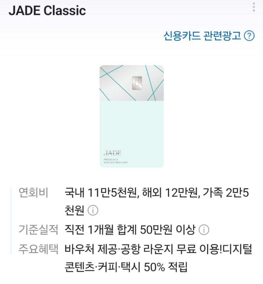 JADE Classic 카드는 동반 2인까지 라운지 이용이 가능한 것이 큰 장점입니다. 발급 후 다음 달까지는 무실적 조건으로 라운지를 이용할 수 있어 여행을 떠나기 전 달에 발급받아 한 번만 사용해도 유용합니다. 또한, 50만 원 이상 사용 시 상품권 바우처를 제공받을 수 있어 실질적인 혜택도 풍부한 카드입니다.