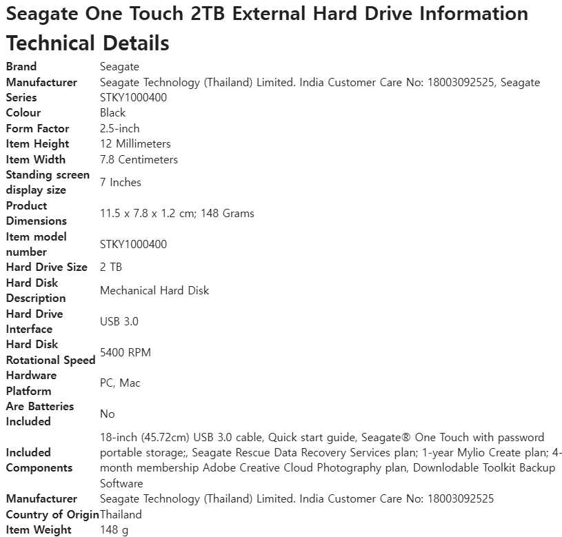 씨게이트 One Touch HDD는 세련된 디자인과 우수한 성능, 그리고 강력한 보안 기능을 갖춘 외장하드로, 일상적인 데이터 관리부터 크리에이티브 작업까지 폭넓게 활용할 수 있는 제품입니다. 데이터 보안과 휴대성을 동시에 추구하는 사용자들에게 강력히 추천합니다.