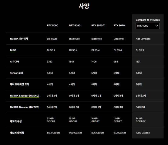 엔비디아 RTX50 모델별 스펙 비교