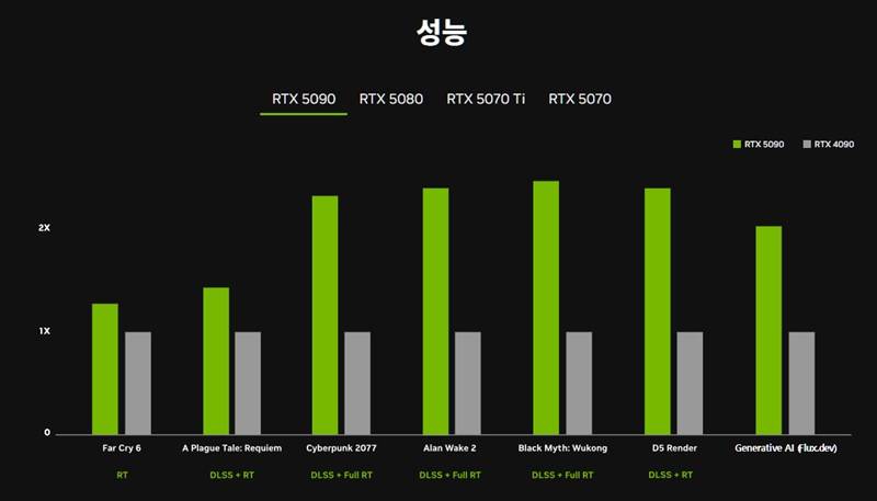| GeForce RTX 5070 Ti | 8,192 | 12GB | GDDR6X | 800GB/s | 300W | 2K 게이밍, DLSS 4 지원 |