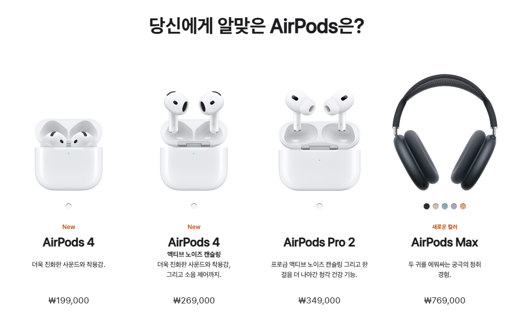 - AirPods Max (USB-C, 2024): USB-C 포트를 채택하며 충전 편의성을 강화했습니다.