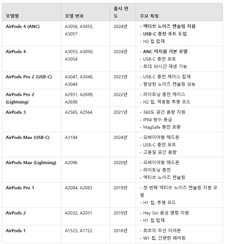 - AirPods 4 시리즈(2024): USB-C 충전 포트를 도입한 최초의 에어팟 시리즈로, ANC 모델과 기본 모델로 나뉩니다.