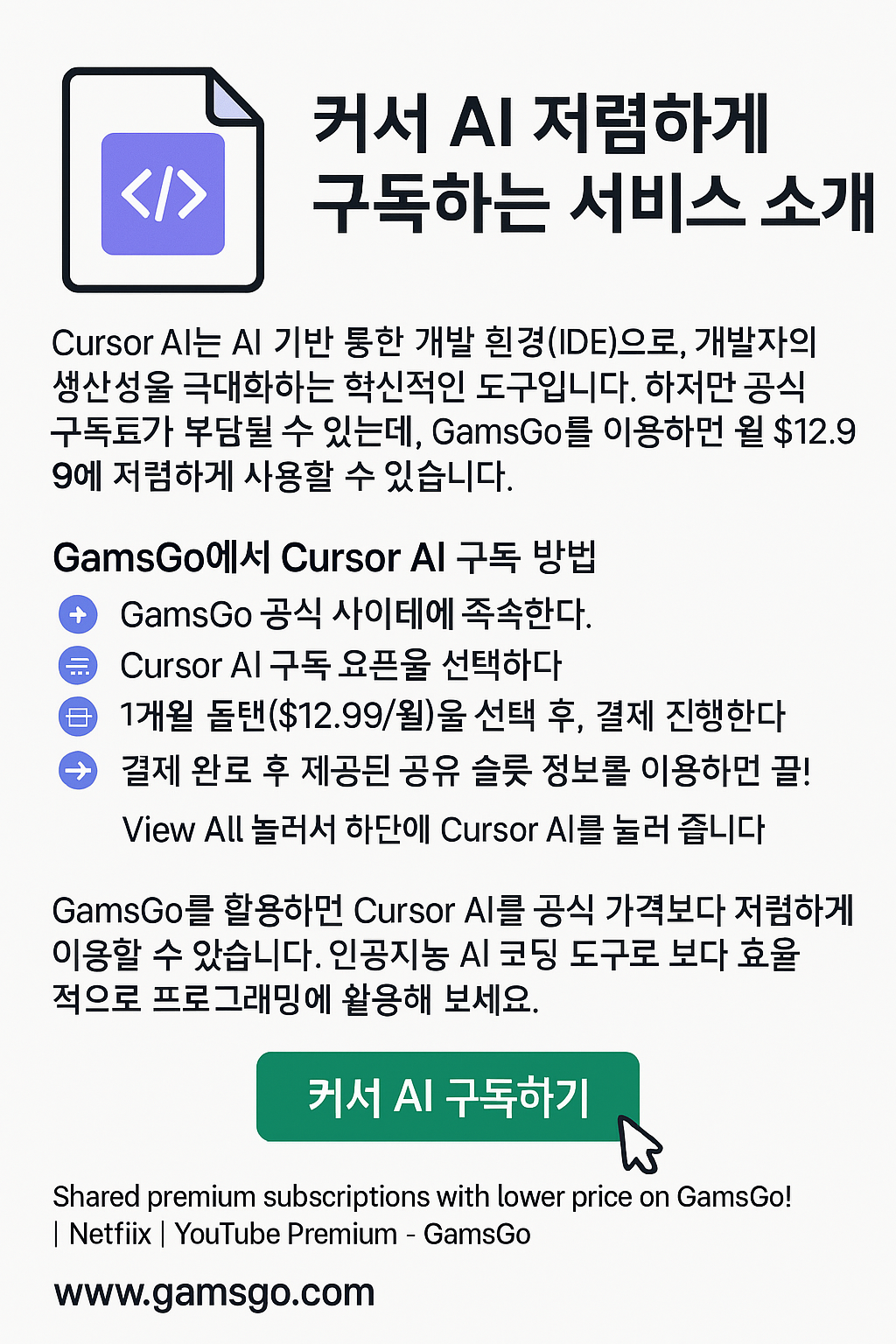 Cursor AI는 AI 기반 통합 개발 환경(IDE)으로, 개발자의 생산성을 극대화하는 혁신적인 도구입니다. 하지만 공식 구독료가 부담될 수 있는데, GamsGo를 이용하면 월 $12.99에 저렴하게 사용할 수 있습니다.
