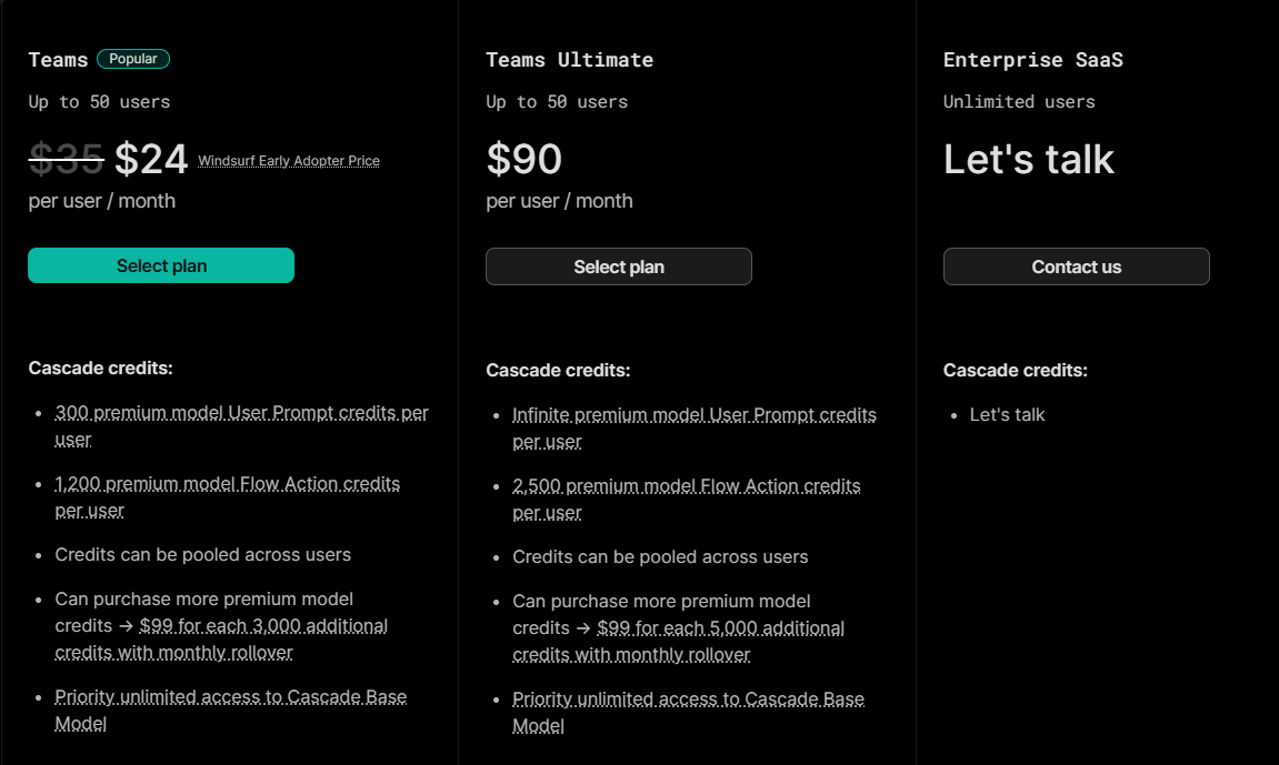 현재 Windsurf Editor는 Teams Plan이라는 무료 요금제를 제공합니다. 이 플랜은 다음과 같은 특징을 가지고 있습니다.