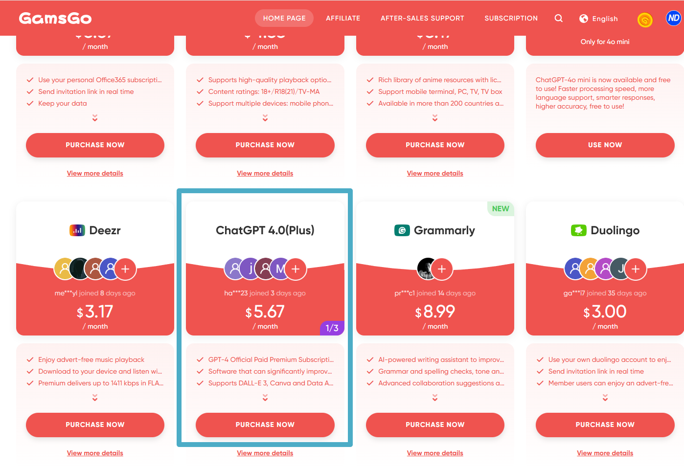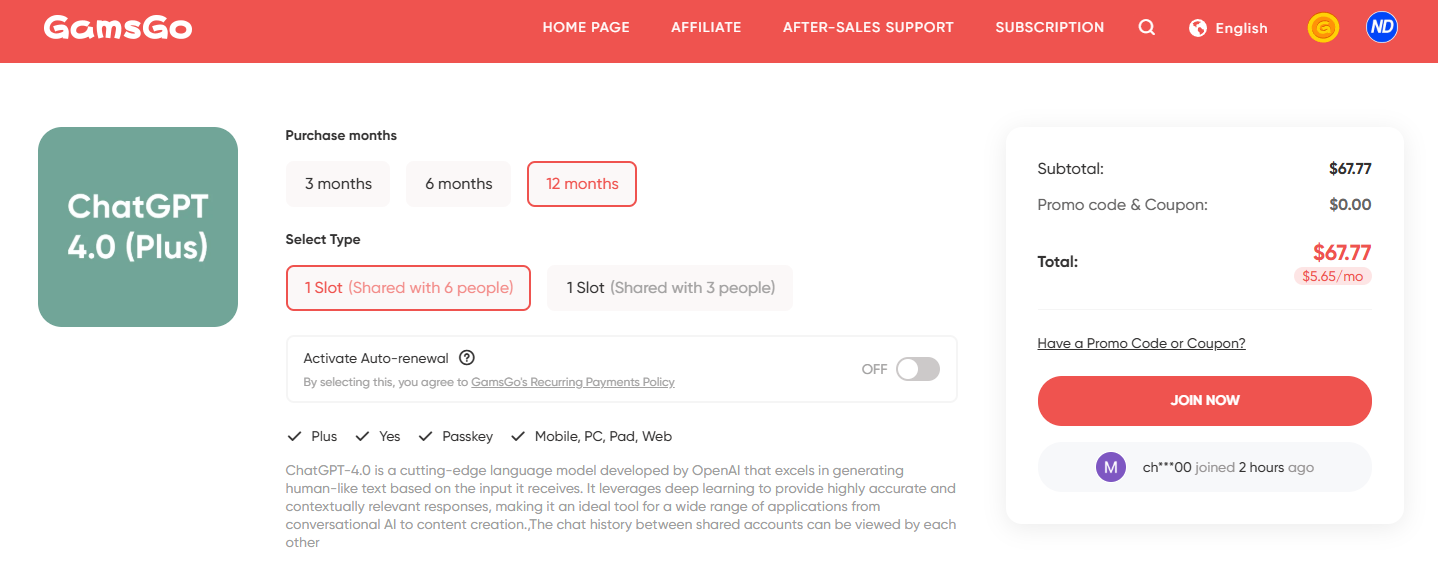 GamsGO는 다양한 구독형 서비스를 저렴한 가격으로 제공하는 플랫폼입니다. ChatGPT를 비롯해 Netflix, YouTube Premium, Disney+ 등의 서비스도 포함되어 있습니다. 겜스고의 방식은 ID를 공유하는 개념이지만, 사용자는 별도의 관리가 필요 없다는 점에서 편리함을 제공합니다.