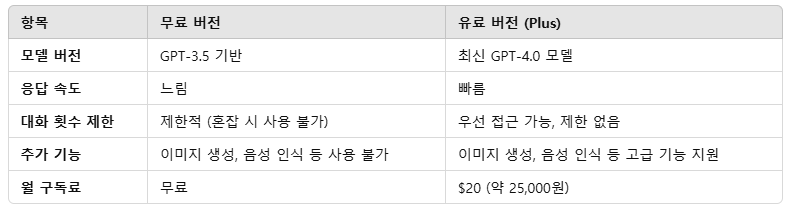ChatGPT는 무료 버전과 유료 버전(Plus)으로 나뉩니다. 무료 버전은 기존에 학습된 데이터만을 기반으로 동작하며, 최신 업데이트나 확장 기능의 사용이 제한됩니다. 예를 들어, 고급 GPT-4 모델의 사용이 불가능하며, 대화 횟수에도 제약이 있습니다.