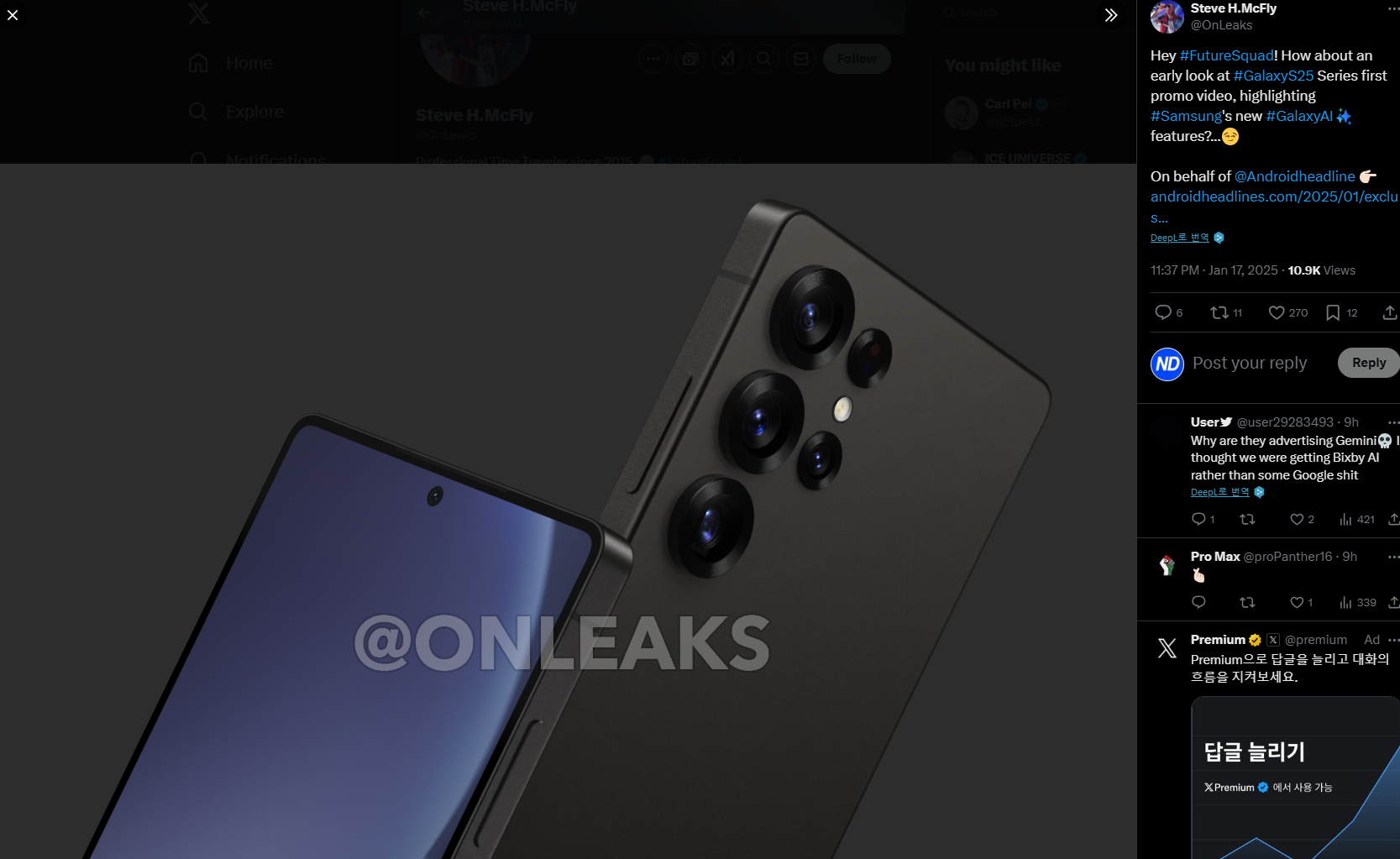 갤럭시S25 울트라 모델 목업이 공개되었습니다. (@onleaks)