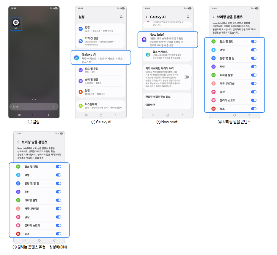 갤럭시 나우 브리프(Now brief) 설정 방법으로 헬스, 여행 등 원하는 걸 켜두면 브리핑 받을 수 있습니다.
