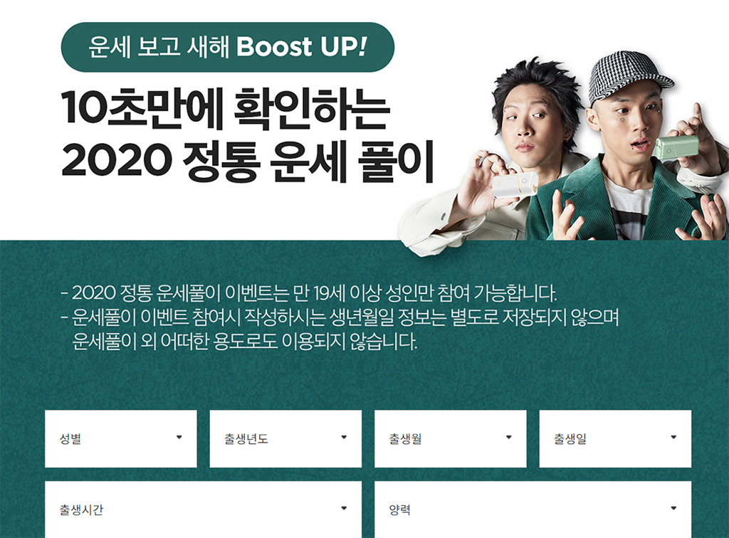 성별, 출생년도를 입력하고 시간까지 입력하고 2020년 신년 운세를 봐봅니다. 올해는?