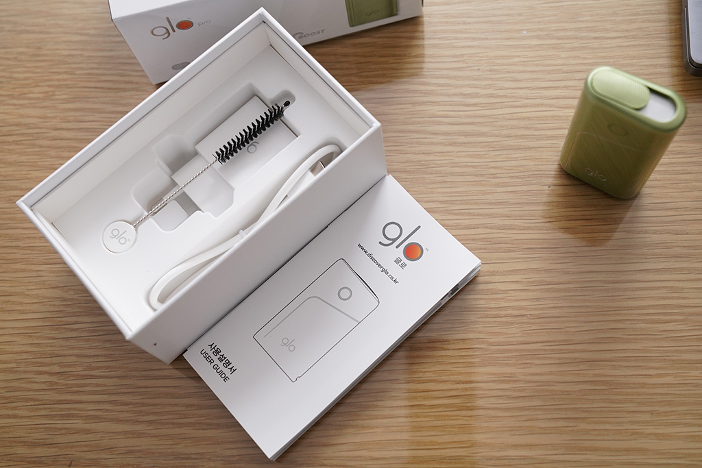 글로 프로 패키지에 안쪽에는 청소솔과 충전 어답터, USB-C 단자 충전기, 매뉴얼이 있습니다.