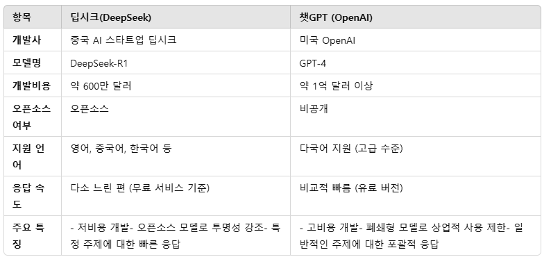 딥시크는 저렴한 개발비용과 오픈소스 모델을 기반으로 AI 기술의 접근성을 높이는 데 초점을 맞추고 있다. 반면, 챗GPT는 비공개 고성능 모델을 활용하여 보다 포괄적이고 정교한 답변을 제공한다. 특히, 챗GPT 유료 버전(GPT-4)의 경우 응답 속도와 정확도 면에서 딥시크보다 앞선다는 평가를 받는다.