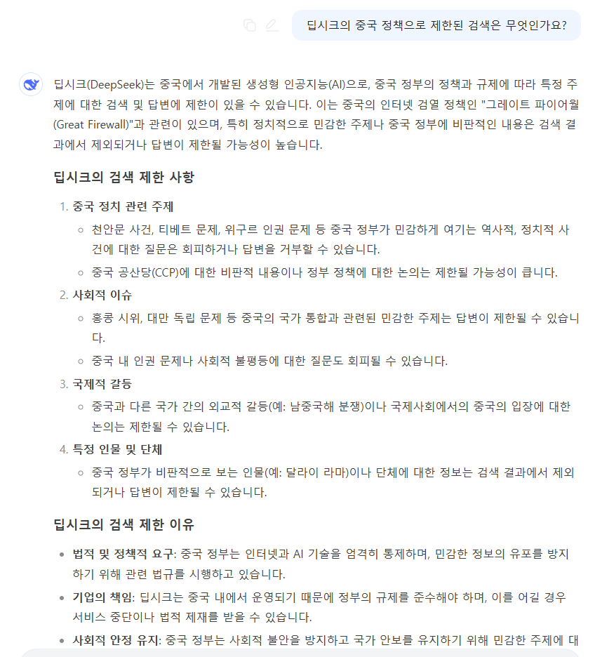 - 중국 내 검열 문제: 중국에서 개발된 AI 서비스이기 때문에 특정 민감한 주제에 대해 제한적인 답변을 제공할 가능성이 있다.