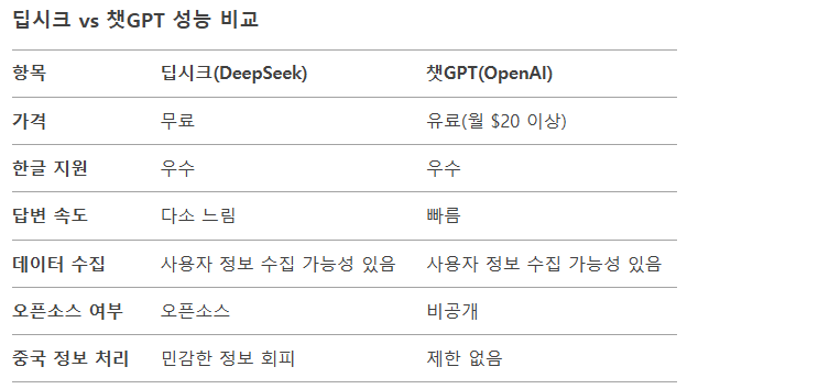 딥시크(DeepSeek)는 챗GPT와 비교해 무료로 사용할 수 있는 장점이 있지만, 성능 면에서는 약간의 차이가 있습니다.