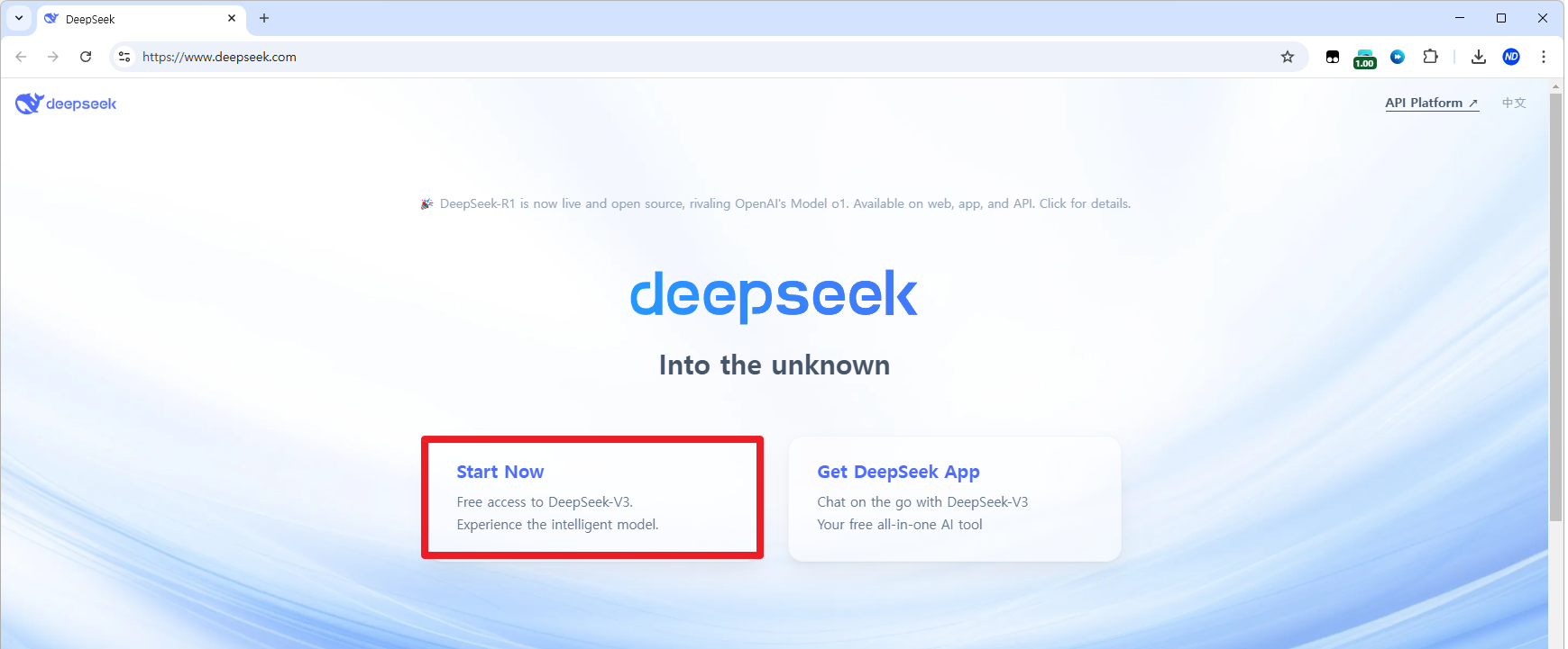 먼저 딥시크 공식 사이트에 접속합니다. 사이트는 영어와 중국어로 제공되지만, 기본적인 인터페이스는 직관적이라 어렵지 않게 사용할 수 있습니다.