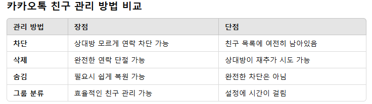 삭제를 하면 완전한 연락 단절이 가능하지만, 상대방이 다시 친구 요청을 보낼 수 있습니다. 숨김 기능을 이용하면 필요할 때 쉽게 복원할 수 있지만, 차단과는 다르게 여전히 연결된 상태로 남습니다. 또한, 그룹 분류 기능을 활용하면 친구를 효율적으로 관리할 수 있지만 설정하는 데 시간이 걸릴 수 있습니다.