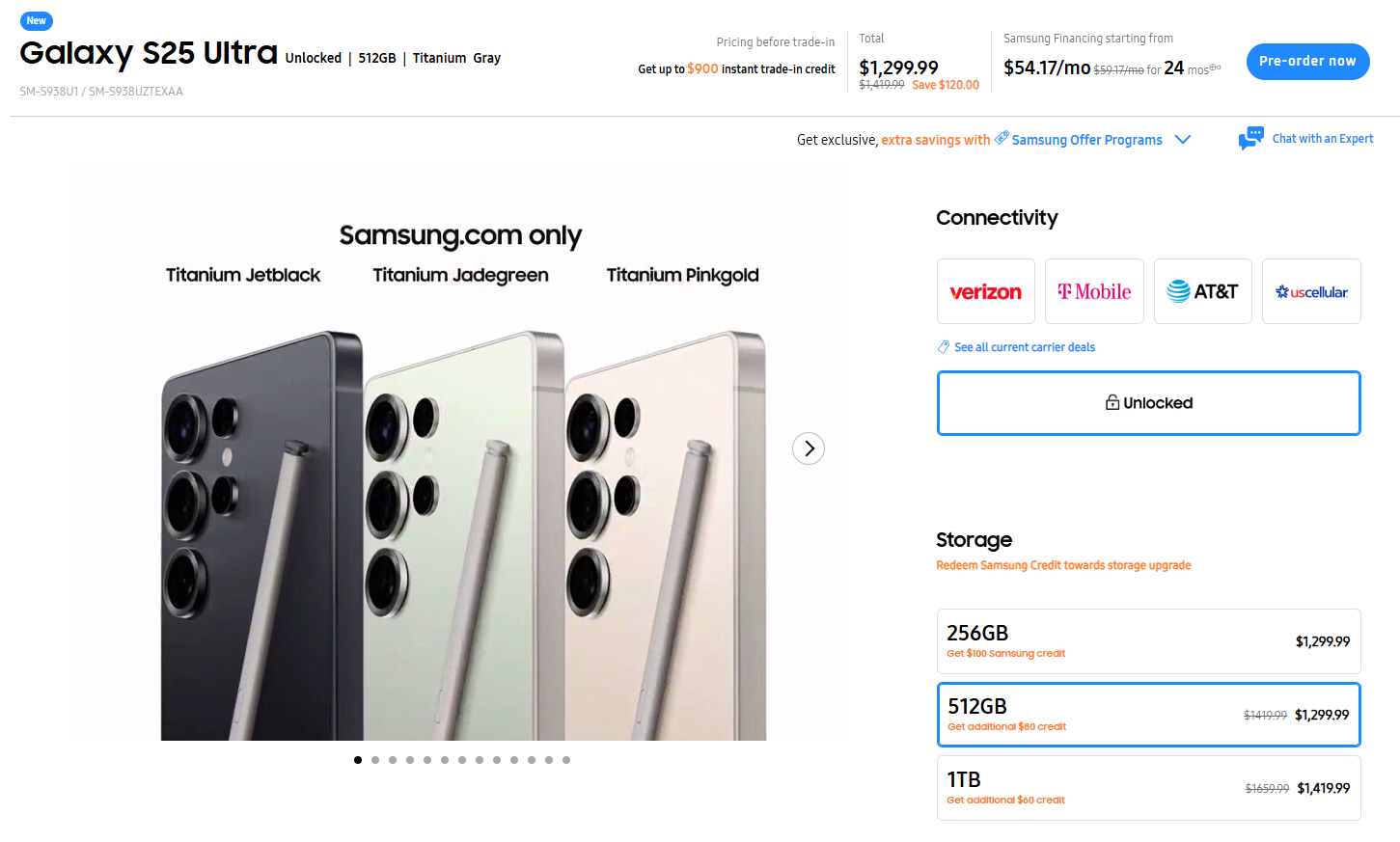 삼성은 또한 모델별 즉시 크레딧을 제공해 무선 이어폰, 스마트워치 등의 액세서리를 할인받을 수 있도록 하고 있다. 갤럭시 S25 울트라 구매자는 최대 300달러 상당의 크레딧을 받을 수 있어, 갤럭시 버즈3 프로를 무료로 제공받거나 최신 갤럭시 워치 울트라를 64% 할인된 가격으로 구매할 수 있다.