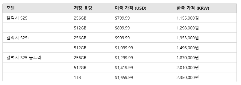 갤럭시 S25 시리즈 미국 가격과 한국의 사전예약 혜택 비교