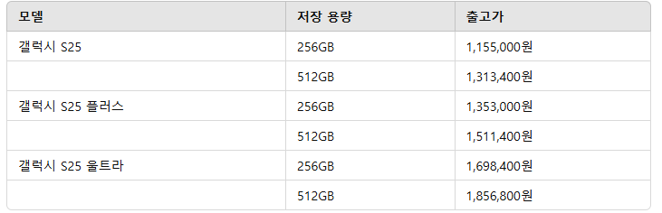 갤럭시 S25 시리즈는 저장 용량에 따라 가격이 다릅니다.