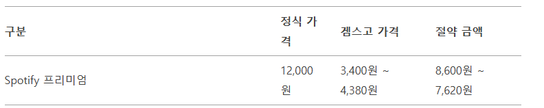 겜스고는 구독 서비스 계정을 공유해 비용을 분담하는 플랫폼으로, Spotify 프리미엄을 최대 80% 할인된 가격에 이용할 수 있습니다. 아래는 정식 가격과 겜스고 가격을 비교한 표입니다.