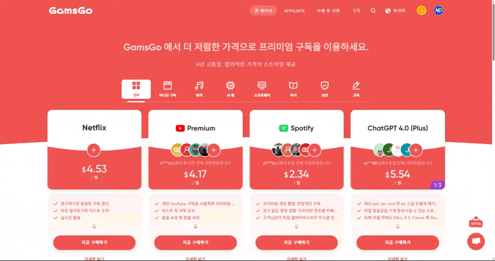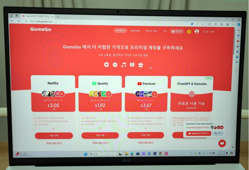겜스고는 넷플릭스, 유튜브 프리미엄, 디즈니 플러스, 스포티파이, 타이달, ChatGPT Plus, 캔바 프로, 어도비와 같은 다양한 OTT 및 디지털 구독 서비스를 저렴하게 제공합니다.