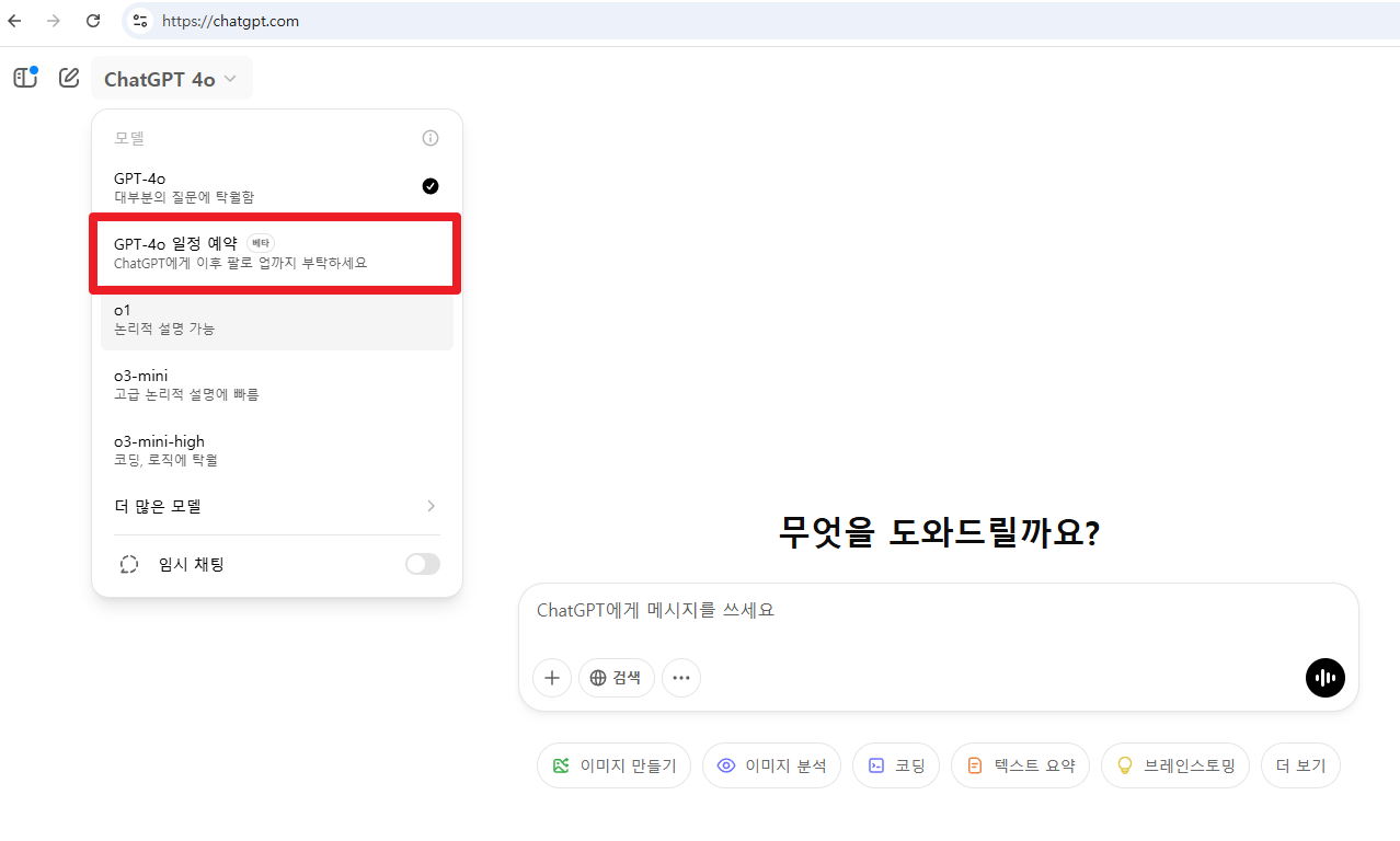 - 모델 선택 화면에서 GPT-4o 일정 예약(베타) 옵션을 확인할 수 있습니다.