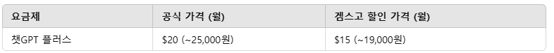 챗GPT 플러스 요금제의 일반적인 가격과 겜스고 프로모션을 적용했을 때의 가격을 비교해보겠습니다.