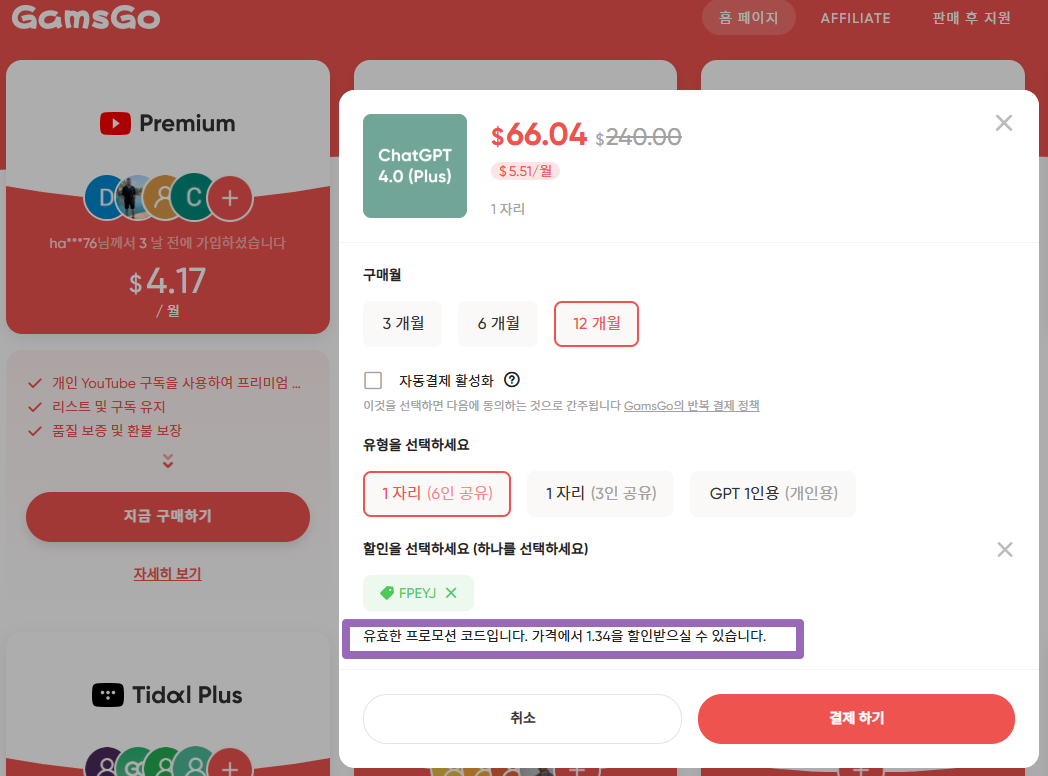 이 코드를 적용하면, 추가 할인된 가격으로 챗GPT 플러스 요금제를 구독할 수 있습니다.