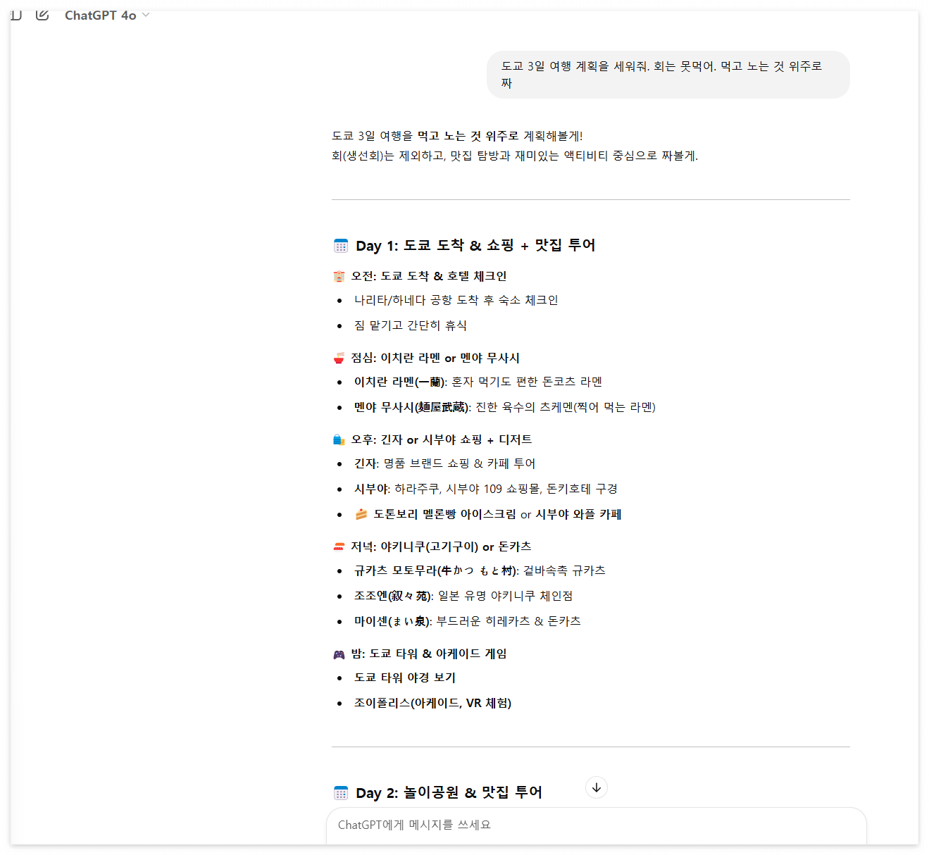 챗GPT는 다양한 분야에서 활용할 수 있는 강력한 도구입니다. 블로그 글, 기사, 보고서, 이메일 등 다양한 문서를 빠르게 작성할 수 있으며, 글의 문체를 조정하거나 요약본을 만드는 데도 유용합니다. 여행계획도 그냥 누르면 바로 나옵니다.