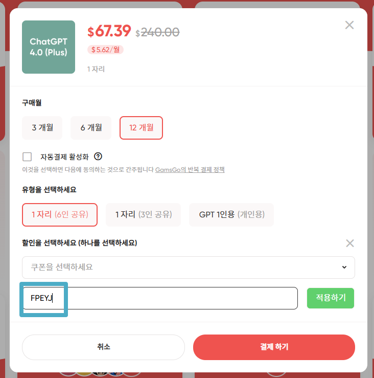 이 코드를 적용하면, 추가 할인된 가격으로 챗GPT 플러스 요금제를 구독할 수 있습니다.