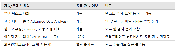챗GPT 엔터프라이즈의 공유 기능이 모든 대화와 기능을 동일하게 지원하는 것은 아니다. 예를 들어, DALL-E나 GPT-V(이미지 기반 기능)를 사용한 대화는 현재 공유가 제한된다. 아래 표는 공유 가능 여부를 정리한 예시다.