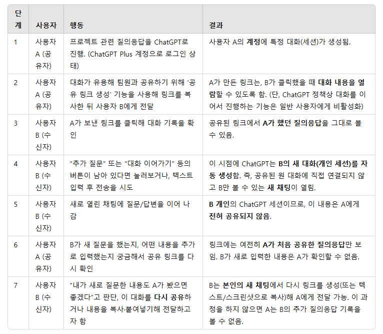 - 결과 공유 여부: 새로 생성된 채팅은 B 개인에게만 보이며, 링크 공유를 다시 하거나 직접 대화 내용을 따로 복사·전달하지 않는 한, 사용자 A를 포함한 다른 사람에게는 보이지 않음.