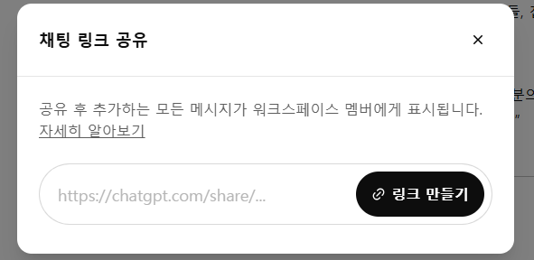 챗GPT를 사용하다 보면, 유용한 답변이나 분석 과정을 다른 팀원과 공유해야 할 때가 있다. 필자는 개발자다 보니 개발적인 토론을 한 것을 팀원들과 공유하여 개발할 때가 있다.