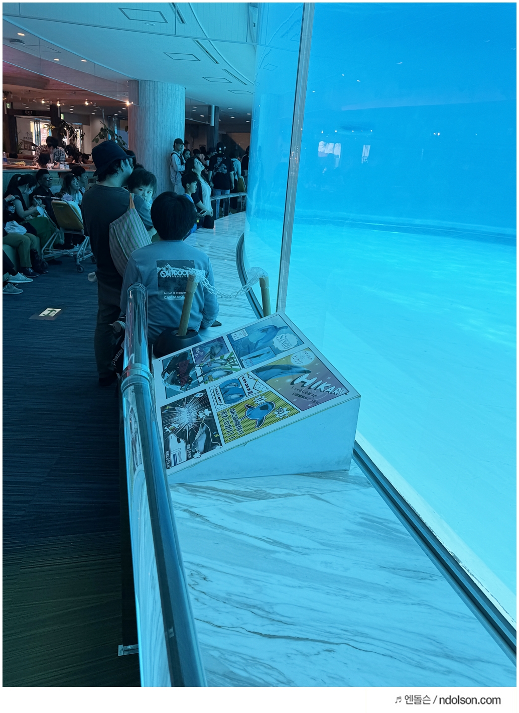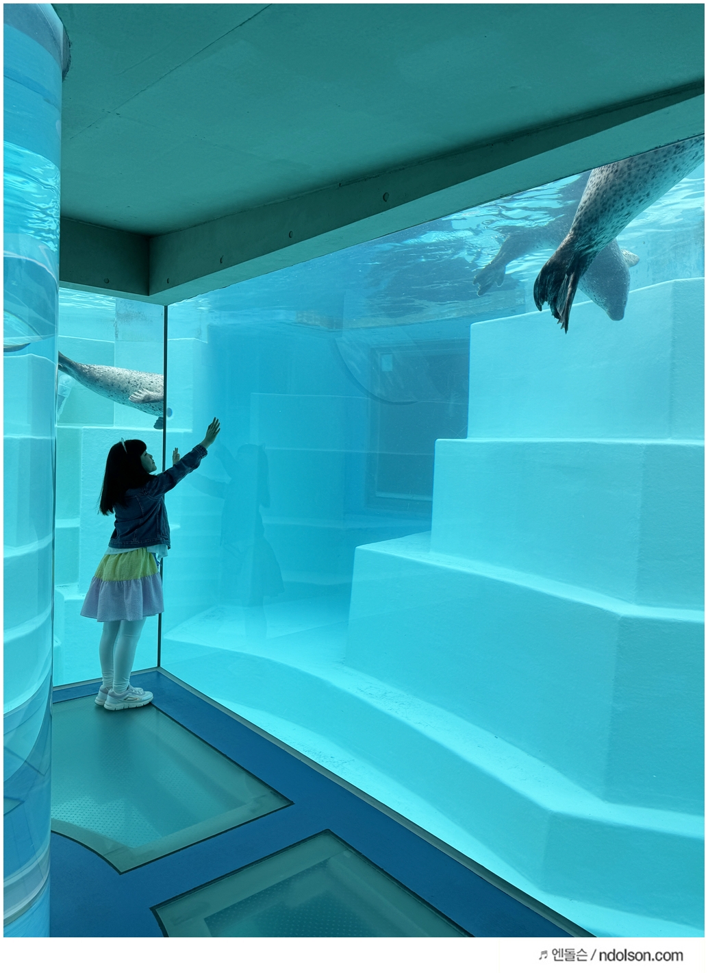 방금 돌고래쇼 보고왔는 데, 그 밑이 식당이라는 게 너무 신기했습니다.