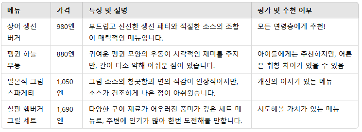 제가 주문한 메뉴는 상어 생선 버거, 펭귄 하늘 우동, 일본식 크림 스파게티로 구성되었는데, 각각의 메뉴 장단점이 있었습니다.