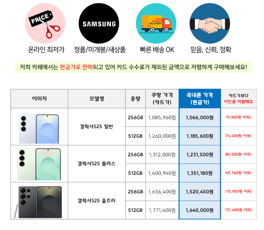 최신폰 갤럭시S25가 출시되었지만, 가격 때문에 망설이는 분들이 많습니다. 그러나 성지카페 국대폰에서 진행되는 온라인 특가를 통해 자급제로 구매하면, 105만 원 현금가라는 파격적인 가격에 만나볼 수 있습니다. 가격이 제일 싸다는 점이 할인 혜택을 많이 줘서 좋긴하네요.