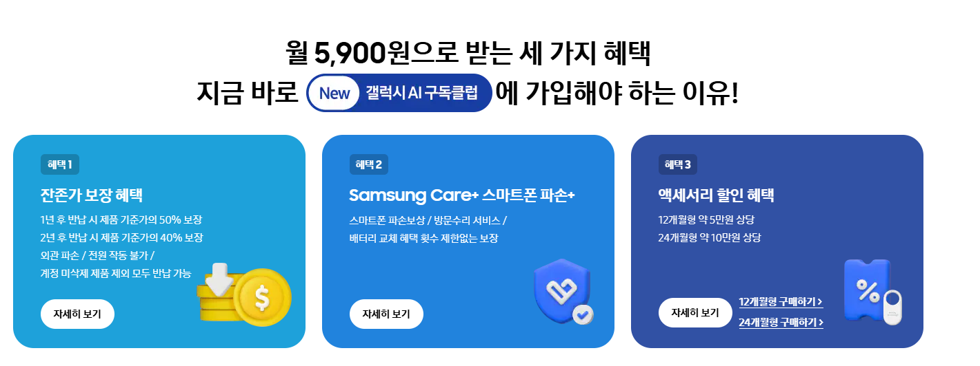 New 갤럭시 AI 구독클럽은 최신 갤럭시 모델을 1년 혹은 2년 단위로 구독하여 사용할 수 있는 유료 서비스입니다. 매월 5,900원이라는 합리적인 구독료를 지불하면, 정해진 기간 동안 갤럭시 S25를 비롯한 최신 스마트폰을 사용한 뒤 반납할 수 있으며, 일정 조건을 충족하면 잔존가 보장 혜택도 누릴 수 있습니다.