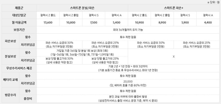 대신 월 이용료가 상대적으로 저렴하며, 갤럭시 Z 시리즈·S 시리즈 외에도 보급형 단말까지 폭넓게 적용되는 경우가 있습니다. 예를 들어 파손+의 월 이용금액은 4,400원 정도로, 분실 보장이 빠진 대신 파손에 특화된 보상 서비스를 제공합니다.
