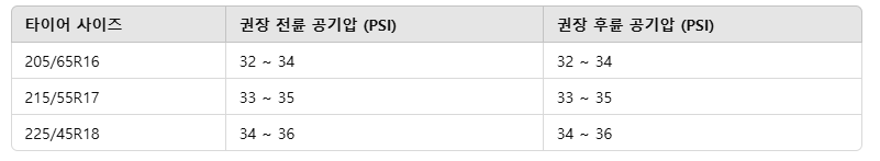 이건 제조사 권장값이므로, 운전자의 운전 스타일이나 차량 적재 상태에 따라 약간 조정할 수도 있습니다. 예를 들어, 장거리 고속 주행을 할 경우 공기압을 1~2 PSI 정도 더 높이는 것이 연비와 타이어 수명 관리에 유리할 수 있습니다.